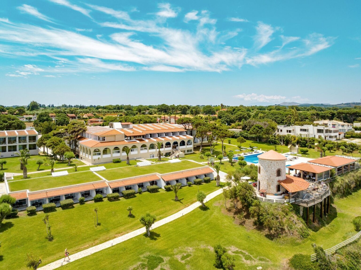 Místo je ideální pro ty, kteří hledají klid, soukromí a autentickou řeckou atmosféru. Hotel nabízí ubytování ve 100 klimatizovaných pokojích s balkonem, některé s výhledem na moře. Hosté mohou využít venkovní bazén, zahradní restauraci, bar s panoramatickým výhledem, tenisový kurt, stolní tenis nebo se zúčastnit tradičních řeckých večerů s hudbou a tancem.