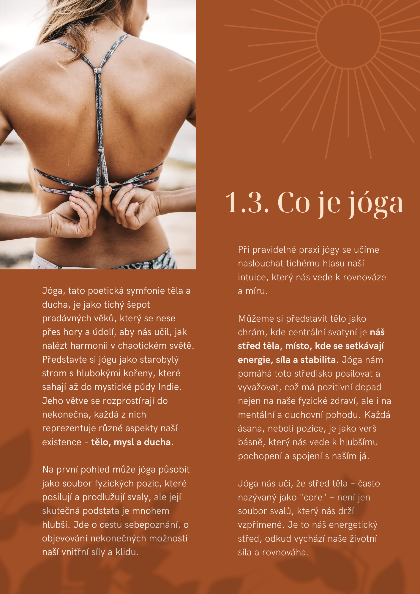 "Jóga není jen fyzická praxe, ale také cesta k objevování tajemství vlastního těla a mysli. A srdcem této cesty je střed těla – místo, kde se setkává síla, rovnováha a harmonie."